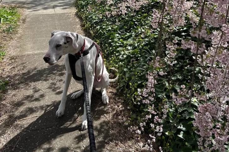 Un Bull Daniff assis sur une surface bétonnée et qui est tenu en laisse