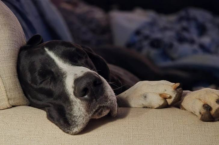 Un Bull Daniff allongé sur un canapé et semblant dormir