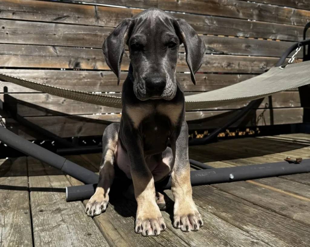 Un chiot Bull Daniff assis sur un plancher assis sur un plancher et regardant vers la caméra