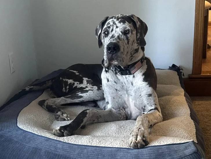 Un Bull Daniff allongé sur un lit pour chien et portant un collier autour du cou