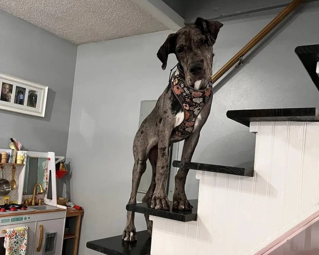 Un Bull Daniff sur une marche d'escaliers et portant un harnais