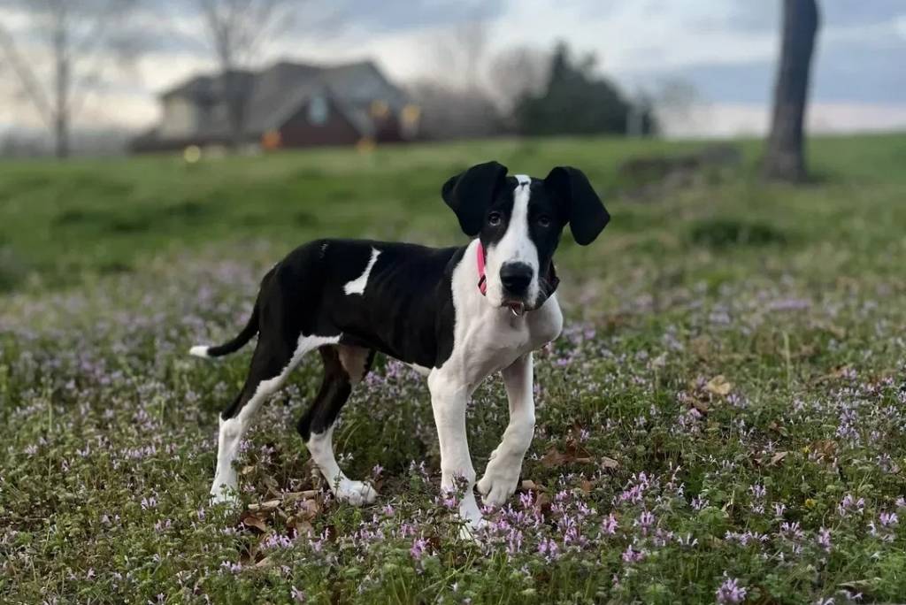 Un chiot Bull Daniff sur un terrain herbeux et portant un collier autour du cou