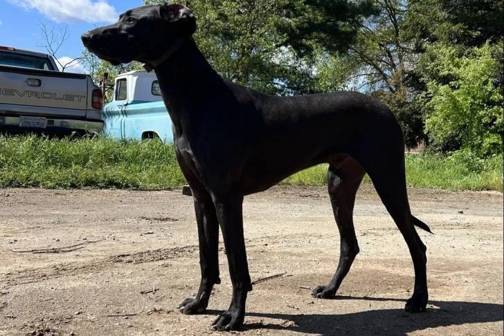 Un Bull Daniff sur une surface sableuse et portant un collier autour du cou