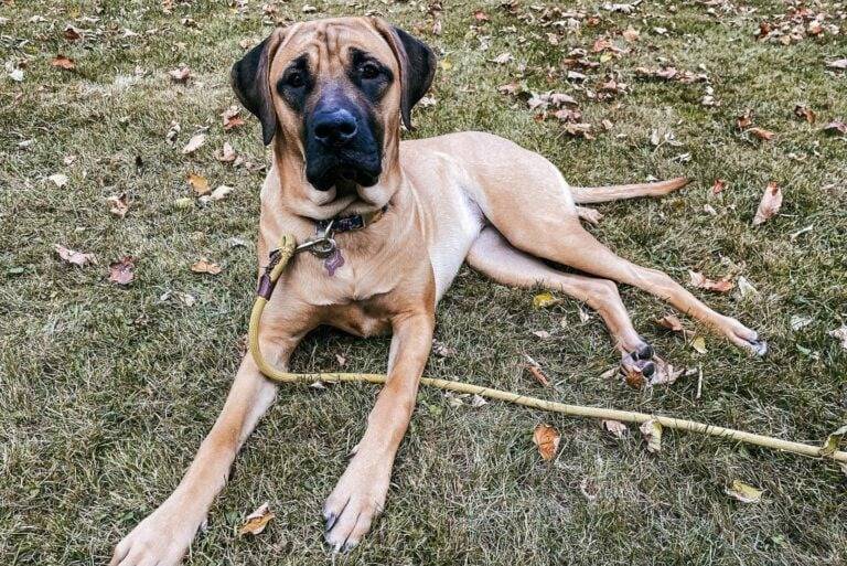 Un Bull Daniff allongé sur un terrain herbeux et qui est tenu en laisse