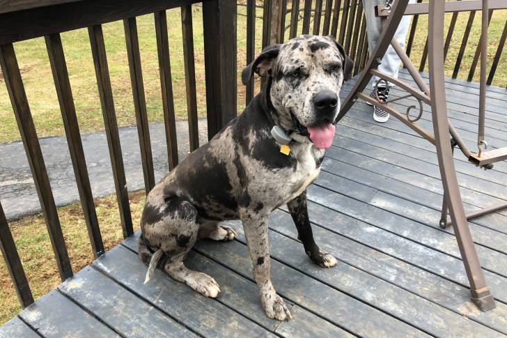 Un Bull Daniff tirant la langue et portant un collier autour du cou