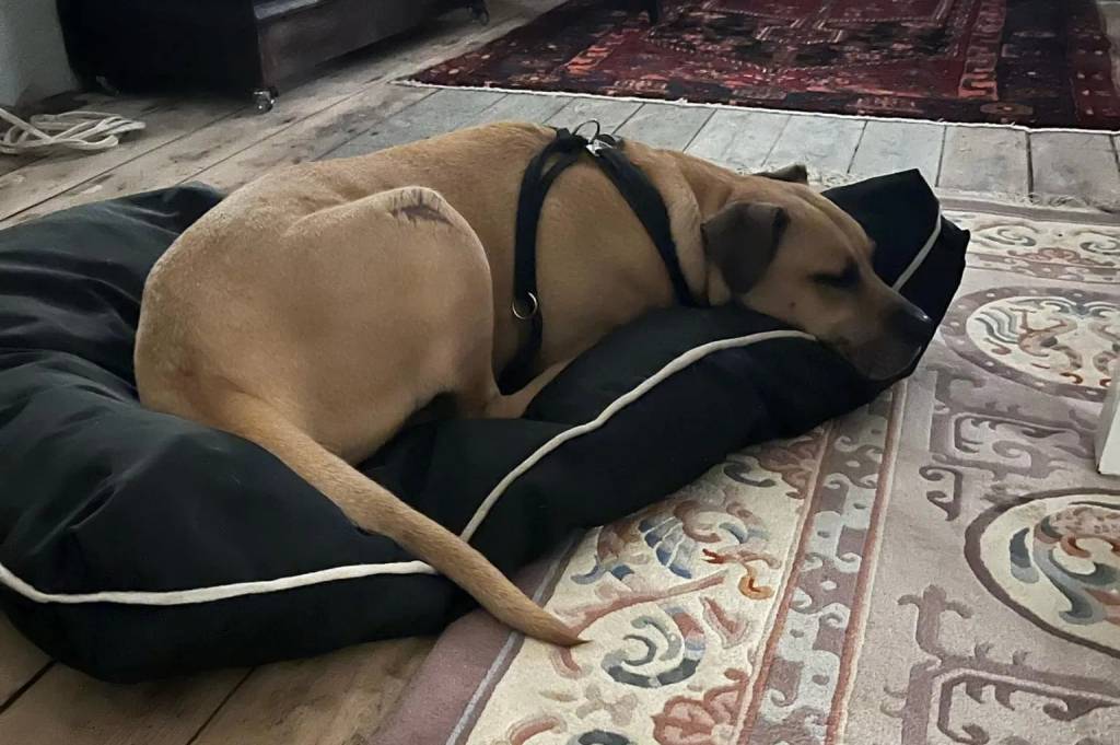Un Bull Daniff allongé sur un lit pour chien et portant un harnais