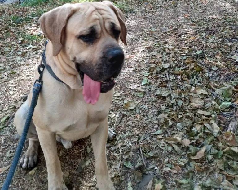 Un Bull Daniff ayant la langue pendante et qui est tenu en laisse