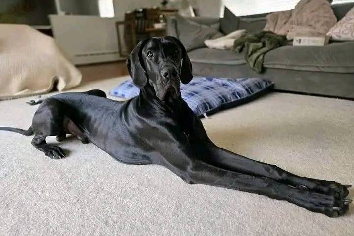 Un Bull Daniff allongé sur une moquette et semblant détendu