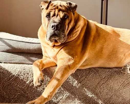 Un Bull Pei allongé sur un canapé et regardant vers la caméra