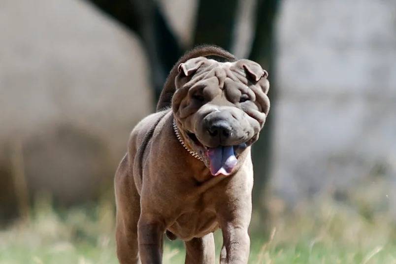 Un Bull Pei sur une surface herbacée et tirant la langue