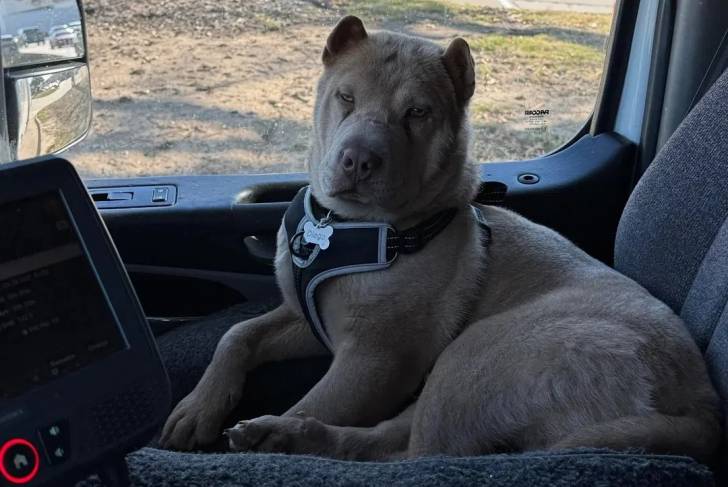 Un Bull Pei allongé sur le siège d'une voiture et portant un harnais