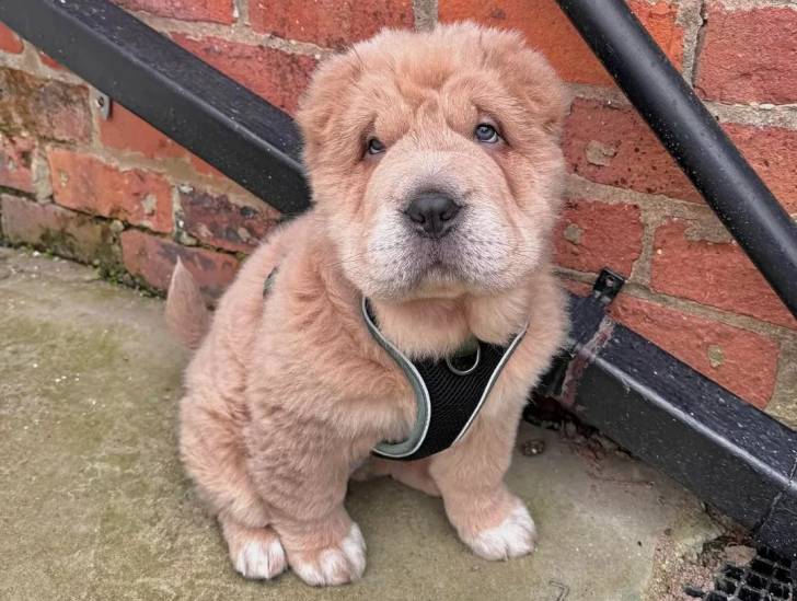 Un Bull Pei assis sur une surface bétonnée et portant un harnais