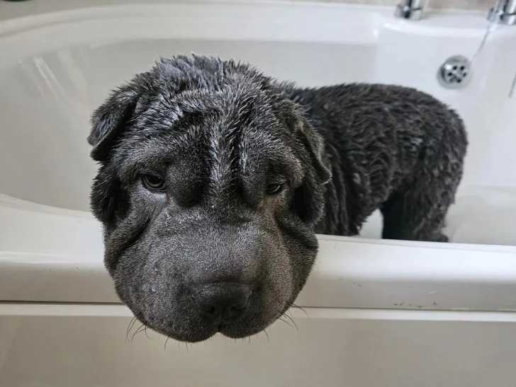 Un Bull Pei dans une baignoire et regardant vers la caméra