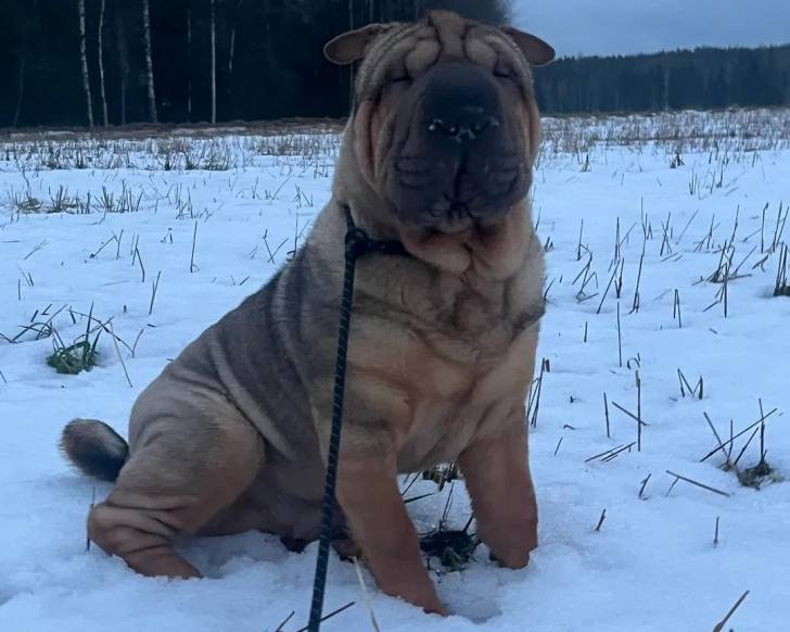 Un Bull Pei assis sur une surface enneigée et qui est tenu en laisse