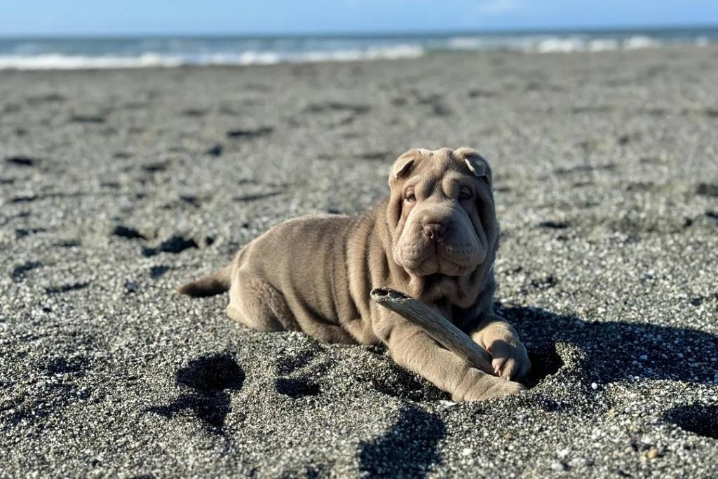 Un Bull Pei sur une surface sableuse et ayant un bâton entre ses pattes
