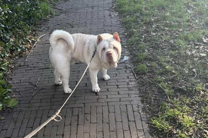 Un Bull Pei sur un sol pavé et qui est tenu en laisse