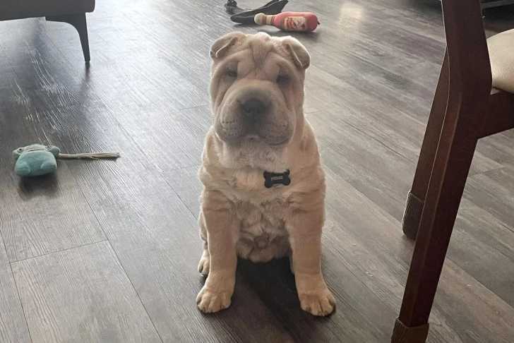Un Bull Pei assis sur un sol carrelé et portant un collier autour du cou