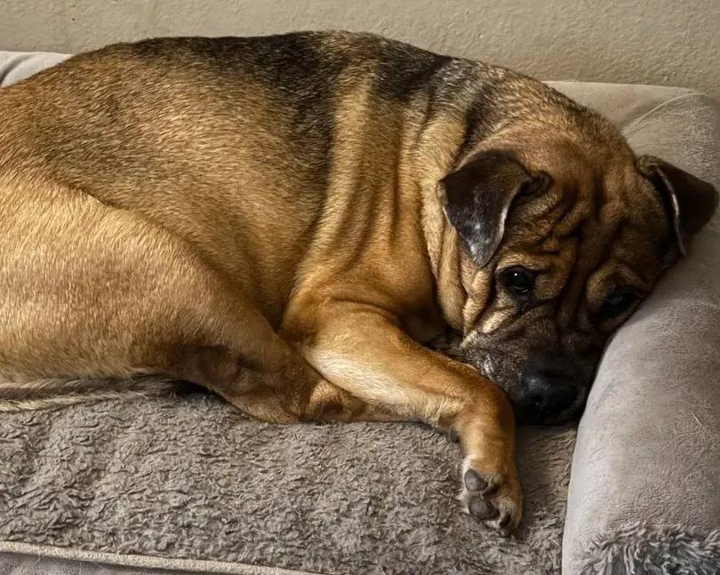 Un Bull Pei allongé dans un panier et regardant vers la caméra