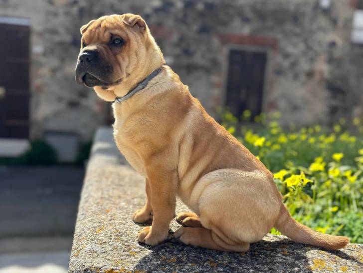 Un Bull Pei assis et portant un collier autour du cou