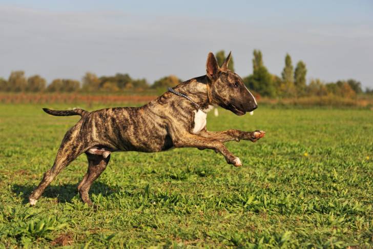 Un Bull Terrier bringé qui court dans l'herbe