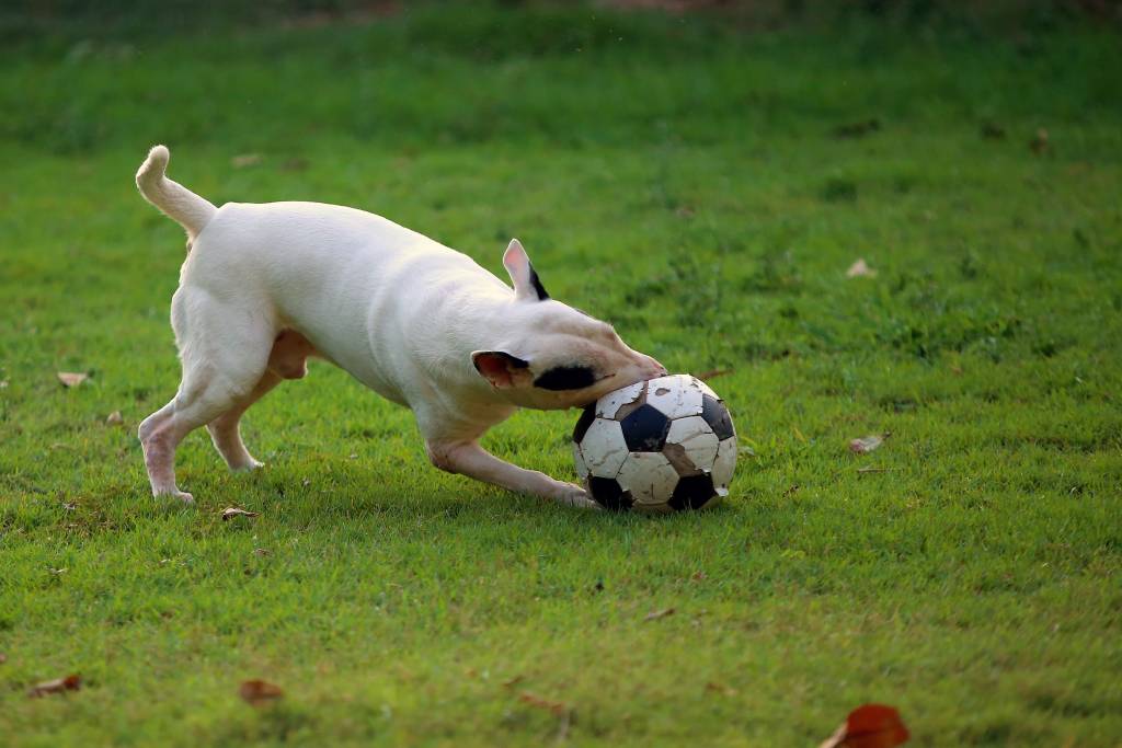 Un Bull Terrier blanc mordant dans un ballon