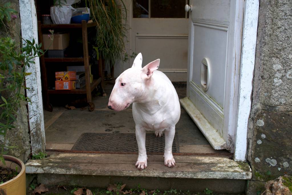 Un Bull Terrier blanc assis sur le perron d'une maison
