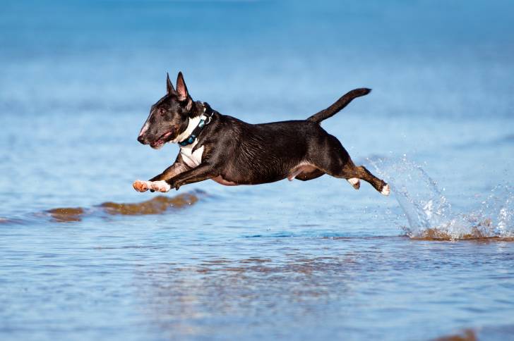 Un Bull Terrier miniature en vacances à la plage