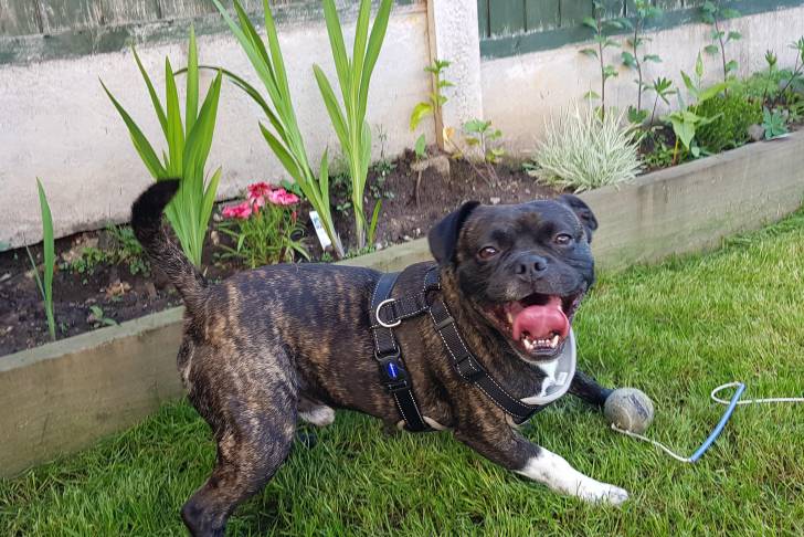 Un Bullpug portant un harnais et en posture quadupède sur une pelouse