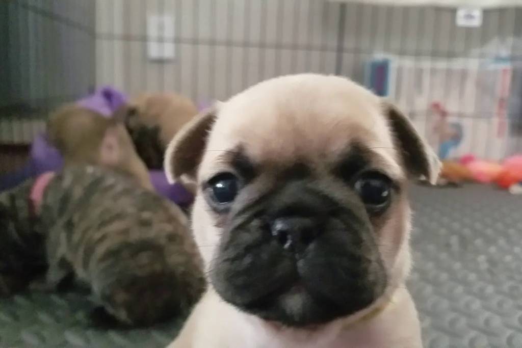 Un Bullpug regardant droit dans la caméra et assis sur un sol recouvert d’un tapis gris