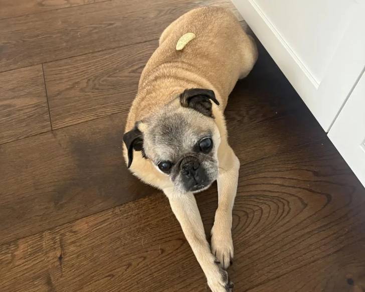 Un Bullpug allongé sur un plancher et semblant détendu