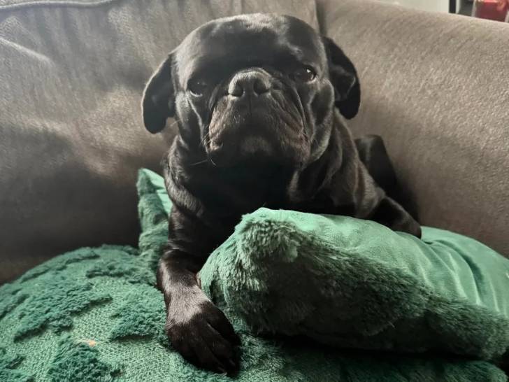 Un Bullpug allongé sur un canapé et regardant vers la caméra
