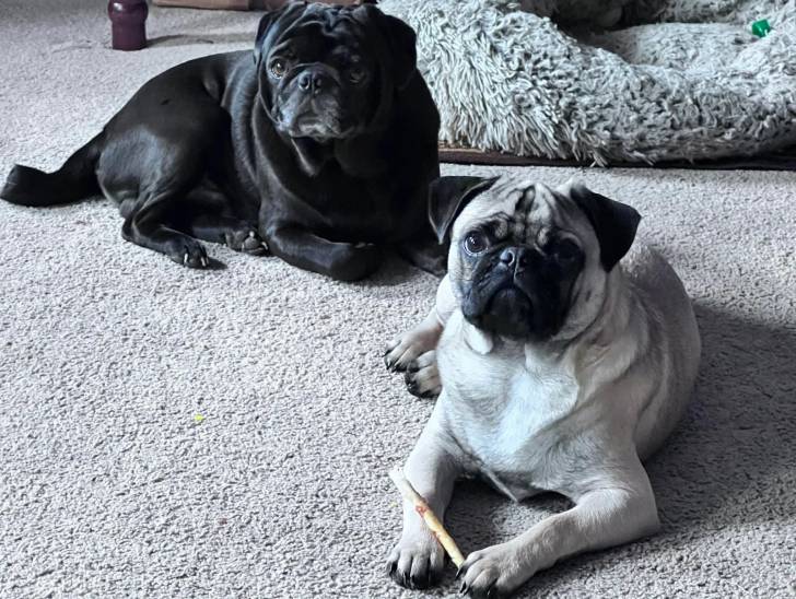 Deux Bullpug allongé sur une moquette et semblant tous les deux détendus