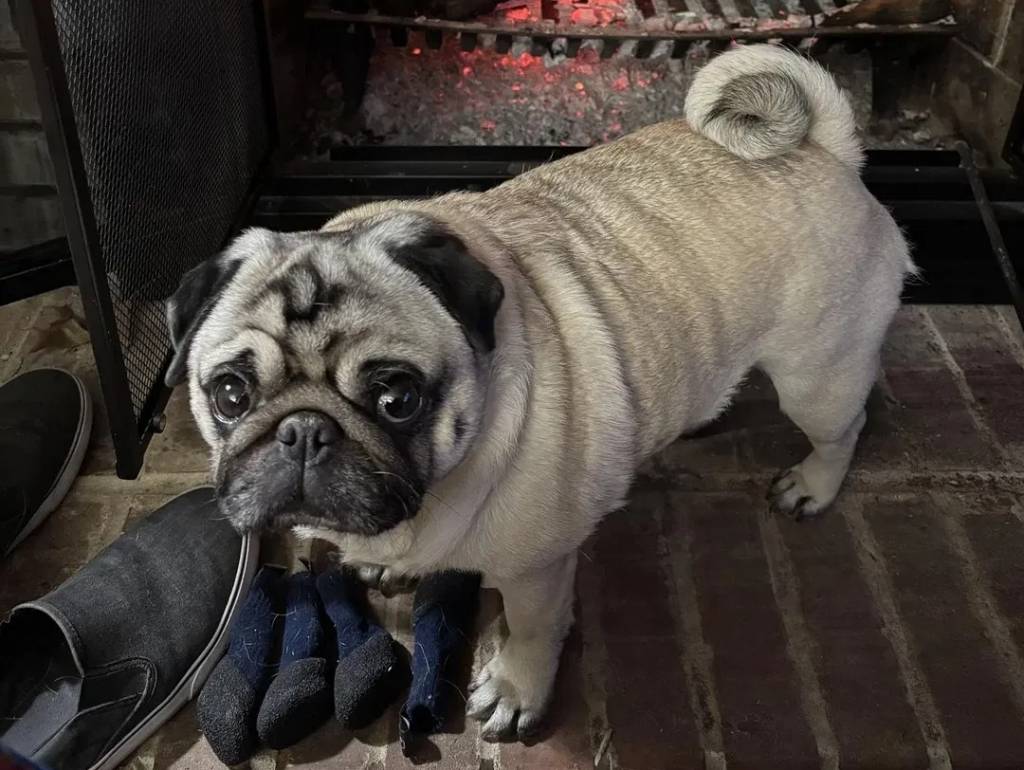 Un Bullpug devant une cheminée et regardant vers la caméra