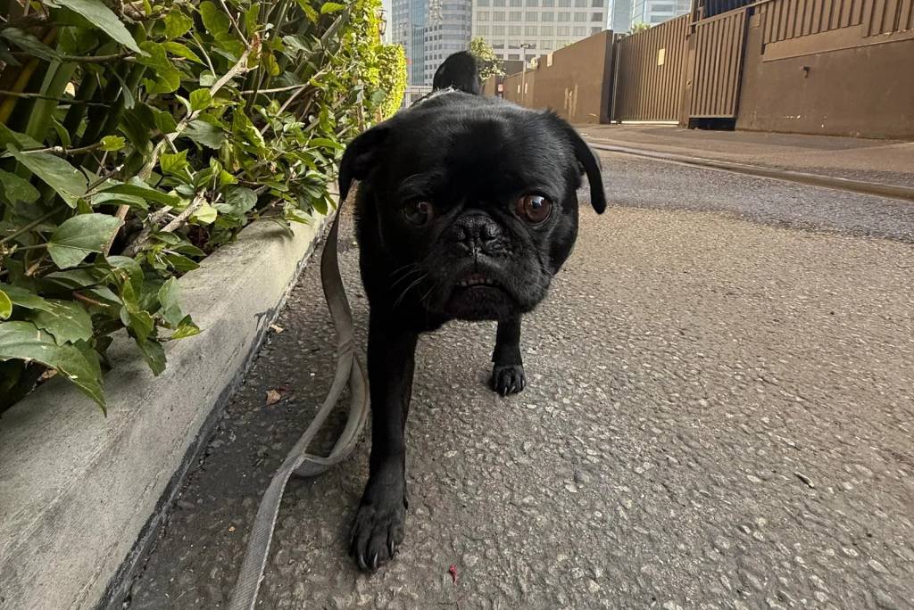 Un Bullpug regardant vers la caméra et qui est tenu en laisse