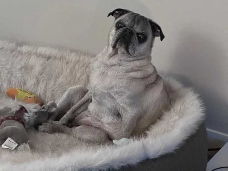 Un Bullpug assis dans un panier et regardant vers la caméra
