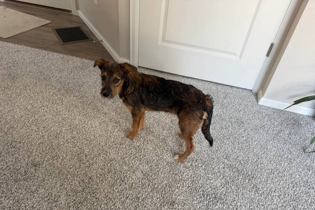Un Cairn Terrier sur une moquette et regardant vers la caméra
