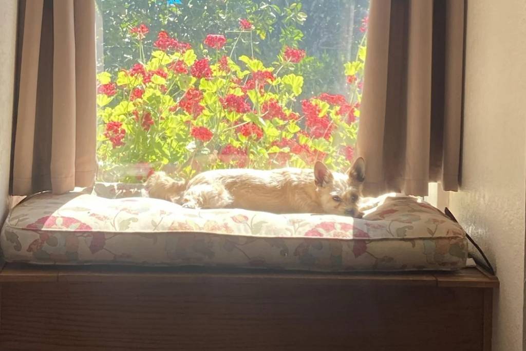 Un Cairn Terrier allongé sur un petit lit et regardant vers la caméra