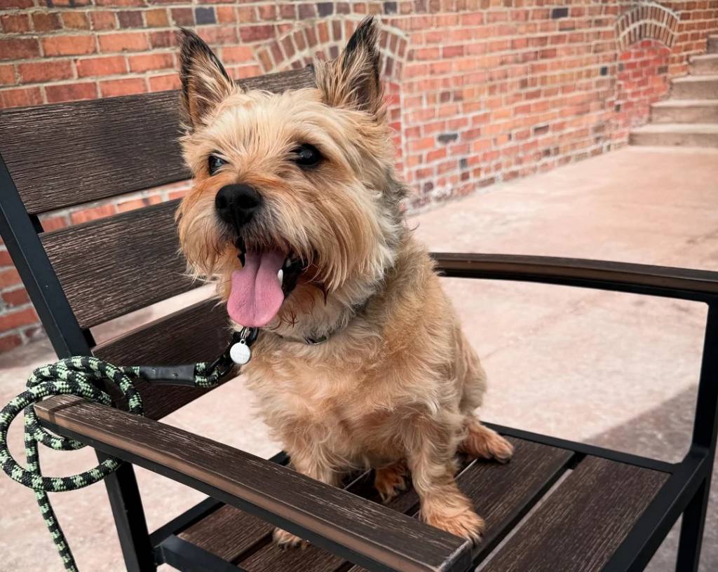 Un Cairn Terrier ayant la langue pendante et qui est tenu en laisse