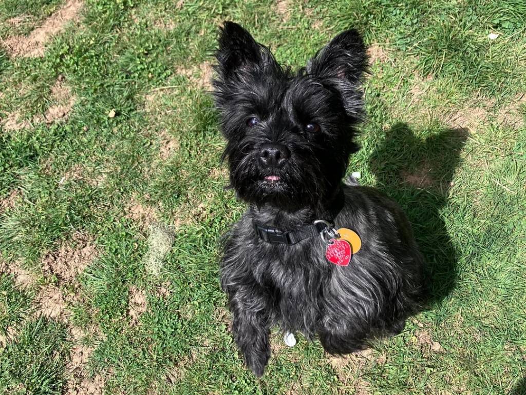 Un Cairn Terrier sur une surface herbacée et portant un collier autour du cou