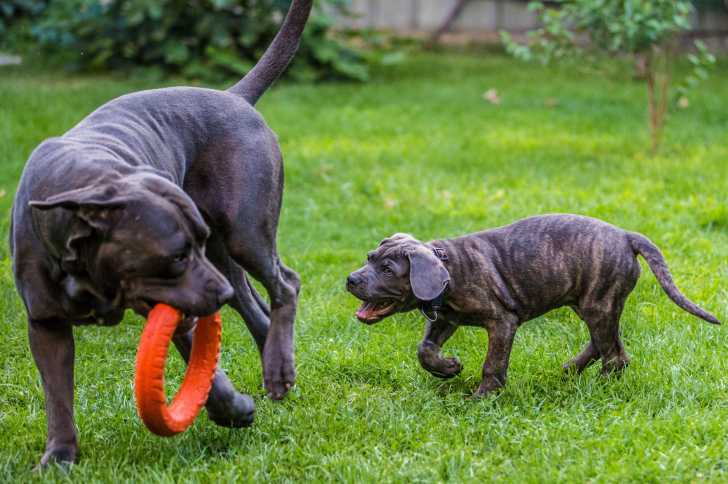 Un chiot Cane Corso jouant avec un Cane Corso adulte dans un jardin