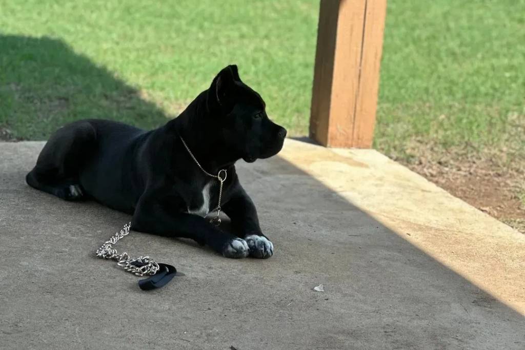 Un Cane Corso allongé sur une surface bétonnée et qui est tenu en laisse