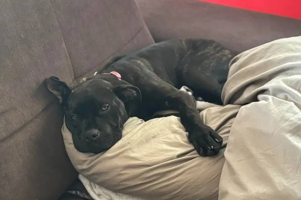 Un Cane Corso allongé sur un canapé et portant un collier autour du cou