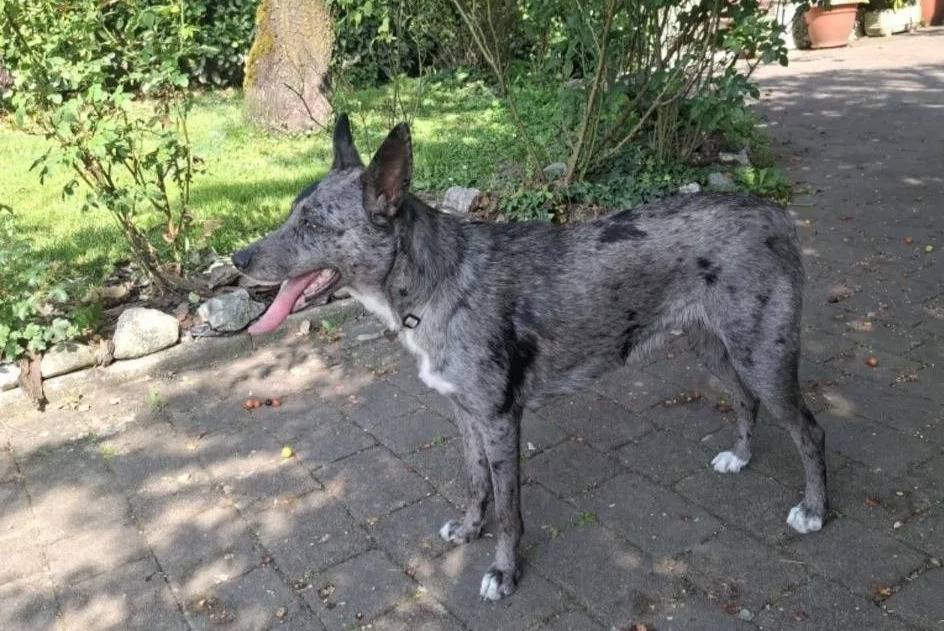 Un Cane delle Alpi Apuane tirant la langue et portant un collier autour du cou