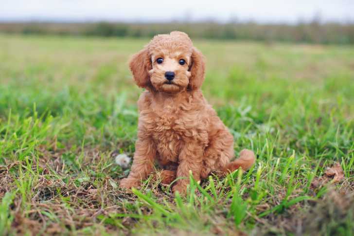 Un chiot Caniche assis dans l'herbe