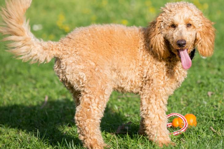 Un Caniche joue dans la neige avec le gant de sa maîtresse