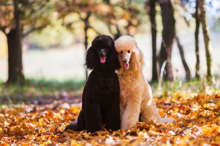 Deux Caniches assis sur des feuilles d'automne