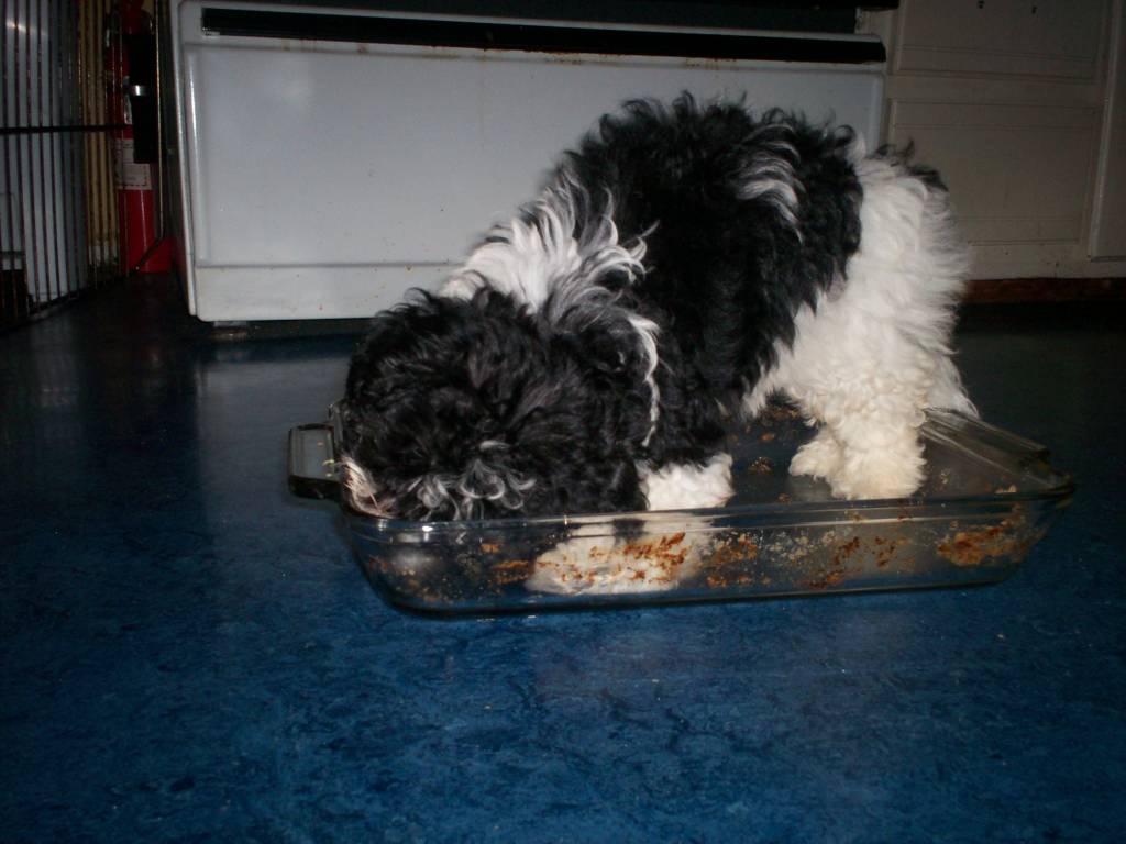 Gribouille à je ne sais plus quel âge qui liche le plat de carré aux dattes. Mais c'est tellement colant qu'il glissait tout le temps alors il a carément mis les 4 pattes dans le plat!!