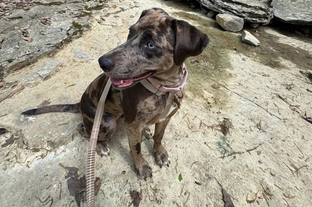 Un Catahoula Heeler assis et qui est tenu en laisse
