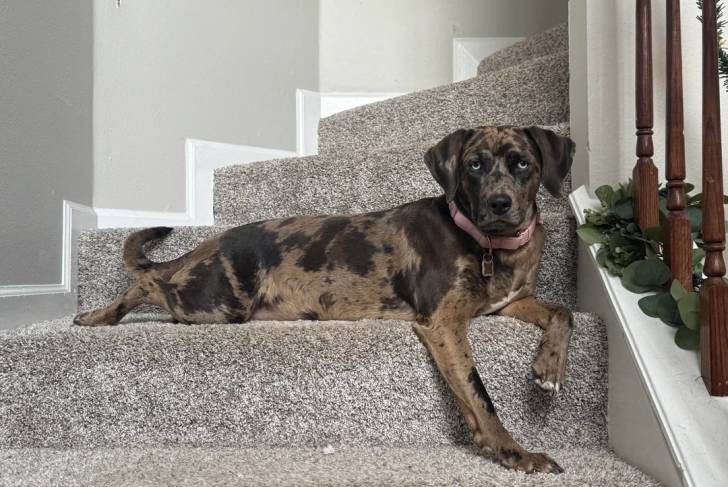 Un Catahoula Heeler allongé sur une marche d'escaliers et portant un collier autour du cou