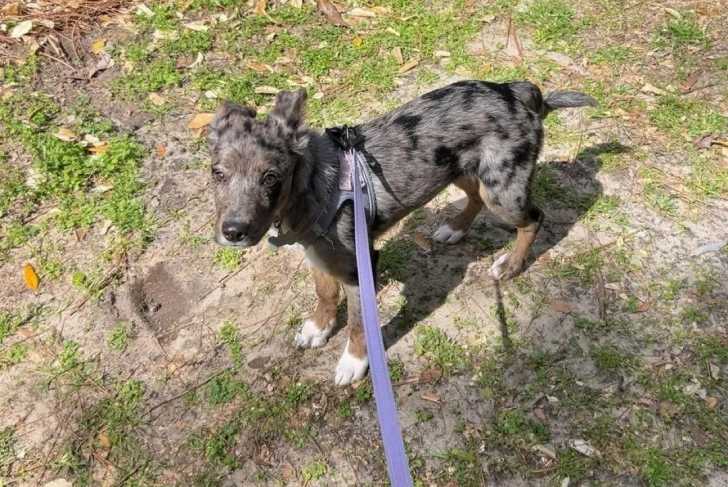 Un Catahoula Heeler sur un terrain herbeux et qui est tenu en laisse